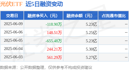 本站消息,6月9日,光伏ETF(515790)融资买入3324.35万元,融资偿还3443.25万元,融资净卖出118.9万元,融资余额5.23亿元。
